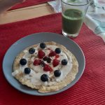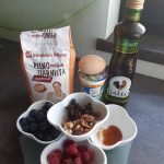 Przepis na omlet: jaja kurze całe, mąka pełnozbożowa 20g, borówki, maliny, orzechy, olej, jogurt naturalny, miód. Jaja i mąkę zmiksować blenderem. Na patelnię z rozgrzanym olejem wlać masę jajeczna. Usmażony omlet położyć na talerz, polać jogurtem wymieszanym z miodem i posypać orzechami.